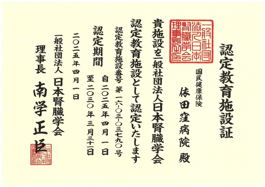 腎臓内科について 日本腎臓学会認定教育施設 日本腎臓学会認定の教育施設として認定されました。当院での腎臓専門医の教育指導を行うことができる施設となりました腎臓学会公認施設として、質の高い医療が提供できるよう努力してまいります。 腎臓内科のこと 腎臓内科についてダウンロード