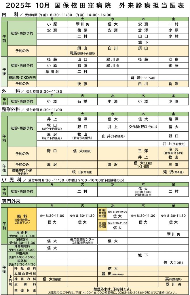 また、診療時間に関しては、診療科により異なりまので、お近くのスタッフにご確認ください。 - 予約の変更については平日14時から16時までにご連絡下さい。