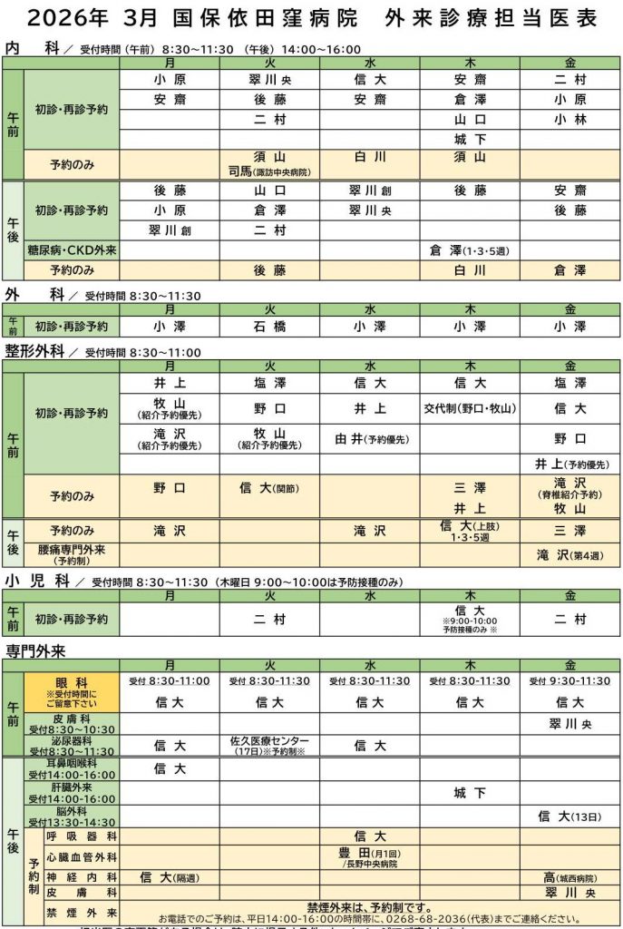 また、診療時間に関しては、診療科により異なりまので、お近くのスタッフにご確認ください。 - 予約の変更については平日14時から16時までにご連絡下さい。
