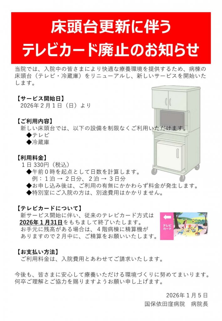床頭台更新に伴うテレビカード廃止のお知らせ